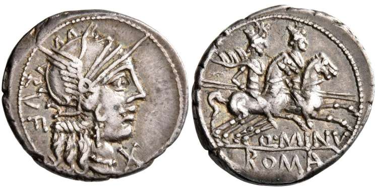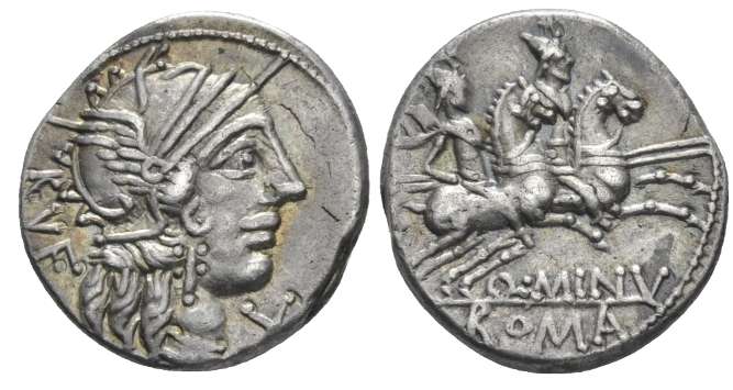 Q Minucius Rufus AR Denarius. 122 BC. Rome Mint. Helmeted head of Roma right, X beneath chin, RVF behind / The Dioscuri riding right, Q MINV beneath horses, ROMA in ex. Cr277/1, Syd 421.