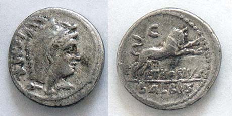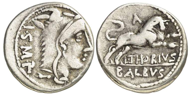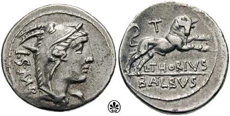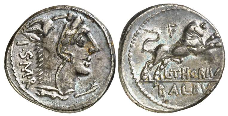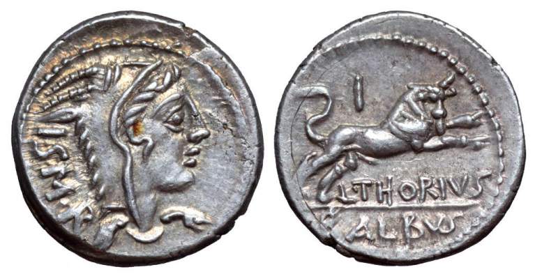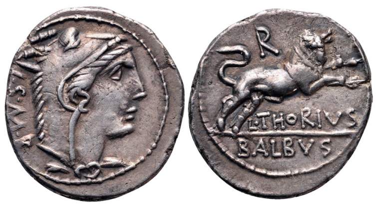 Republican Denarius. 105 BC. L. Thorius Balbus. Rome. ISMR abbreviated legend behind head of Juno Sospita right, wearing goat-skin headdress / Bull charging right; L THORIVS BALBVS legend in two lines in exergue, control letter A to V above. Crawford 316/1; Sydenham 598; Thoria 1; Sear 192.
