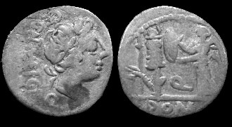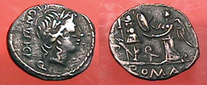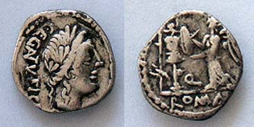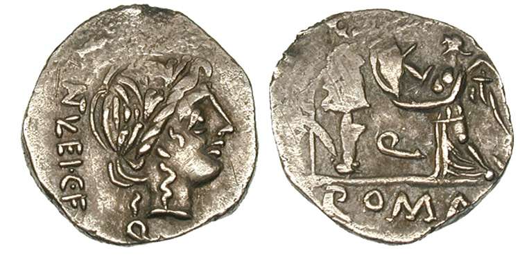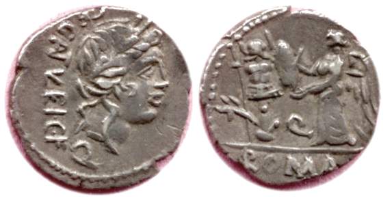 Quinarius of the Republic. 97 BC. Laureate head of Apollo / Victory inscribing shield on trophy. Egnatueleia 1, Syd 588.