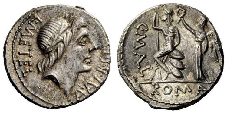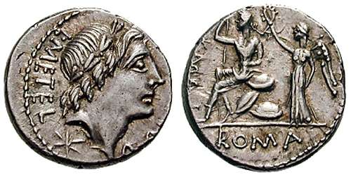 C. Publicius Mall., A. Postumius Albinus & L. Metellus, AR denarius, 96 BC. 3.90 g. L METEL A ALB S F, Laureate head of Apollo right, star beneath chin / C MALL, Roma seated left on pile of shields, holding sceptre, being crowned by Victory standing left behind her. ROMA below. Caecilia 46; Postumia 3; Syd. 611a; C 335/1b; Sear 220.