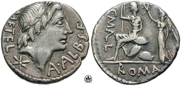 L Caecilius Metellus. 96 BC. AR Denarius. L•METEL A•ALB•S•F, laureate head of Apollo right; star below / C•MALL, ROMA in exergue, Roma seated left on pile of arms, being crowned by Victory. Cr335/1b; Syd 611a.