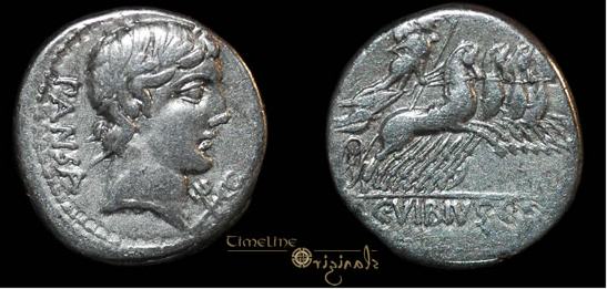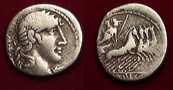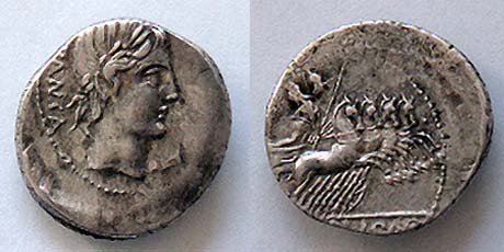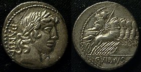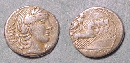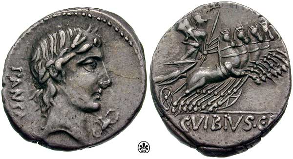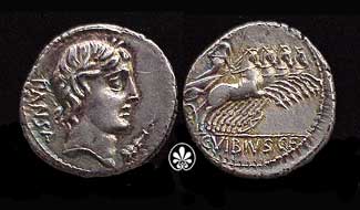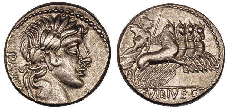 C Vibius Cf Pansa Denarius. 90 BC. PANSA, laureate head of Apollo right, control mark before / Minerva in quadriga right, C VIBIVS CF in ex. Crawford 342/5b; Syd 684.