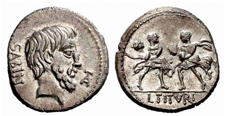 L. Titurius L.f. Sabinus. 89 BC. AR Denarius. Head of Tatius right; SABIN behind, TA before / Two Roman soldiers, each carrying a woman; L. TITVRI in exergue. Cr344/1a; Syd 698.