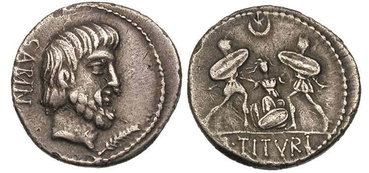 L Titurius Lf Sabinus denarius. 89 BC. Head of Taitus facing right, SABIN behind, palm before / Tarpeia buried to waist in sheilds. Tituria 4, Syd 699.