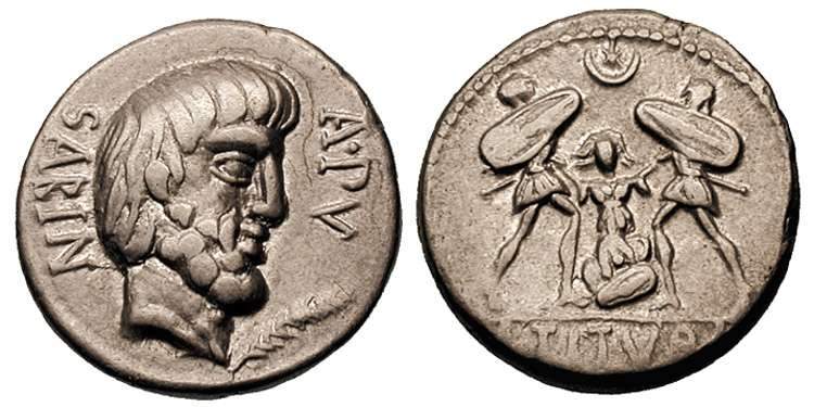 L Titurius Lf Sabinus Denarius. 89 BC. Head of Tatius right, palm below chin; SABIN behind, A.PV before / L TITVRI in exergue, Tarpeia buried to her waist in shields, fending off two soldiers about to throw their shields on her. Cr344/2c, Syd 699a.