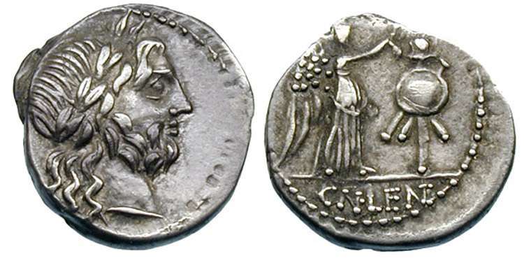 Cn. Lentulus Clodianus. 88 BC. AR Quinarius (1.66 gm). Laureate head of Jupiter right / Victory crowning trophy. Crawford 345/2, Syd 703; Cornelia 51.