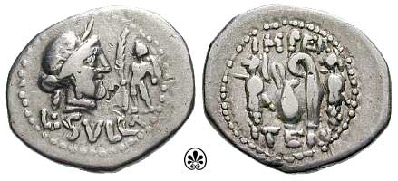 L.Sulla. 84-83 BC. AR Denarius (3.86 gm). Diademed head of Venus right; cupid with long palm branch before / Capis and lituus between two trophies. Cr359/2; Syd 761; Cornelia 30.