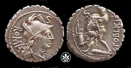 C Poblicius Qf Denarius Serratus. 80 BC. ROMA, draped bust of Roma right, helmeted & decorated with corn ears, control mark letter above / C•POBLICI•Q•F, Hercules strangling the Nemean lion, club at his feet, bow and arrow in quiver on left, control mark letter, often retrograde, in upper left field. Cr380/1, Syd 768.