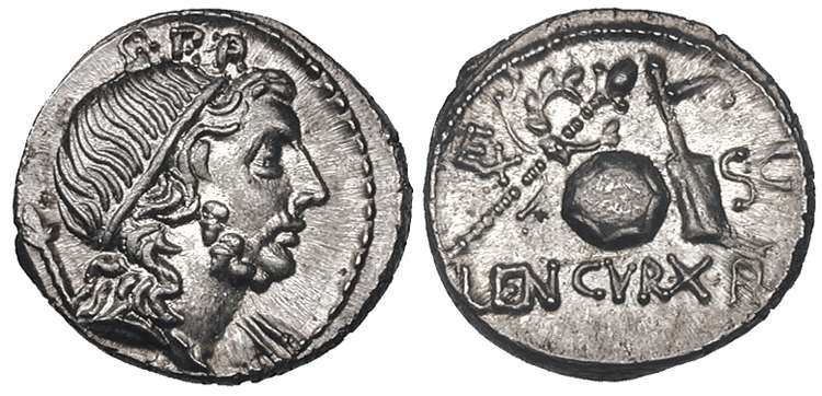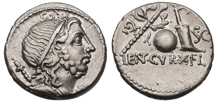 Cn Cornelius Lentulus Marcellinus AR Denarius. Spanish mint (?), ca 76-75 BC. Diademed & draped bust of Genius of the Roman People, sceptre over shoulder, G.P.R above head / sceptre with wreath, globe & rudder, EX-S.C across fields, LENT.CVR*FL below. Cr393/1b, Syd 753.