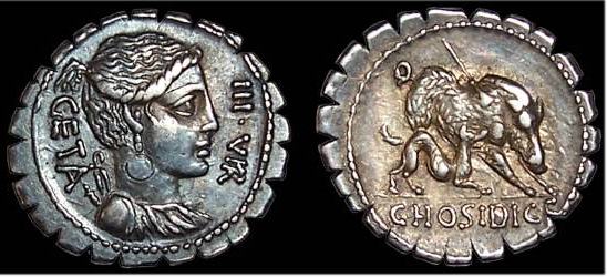 C Hosidius Cf Geta. 64 BC. AR Denarius. GETA behind, III VIR before, draped bust of Diana right (no diadem), bow and quiver on shoulder / C HOSIDI C F, wild boar of Calydon right, pierced by spear and attacked by dog. Hostidia 2; Syd 904, Cr407/1.