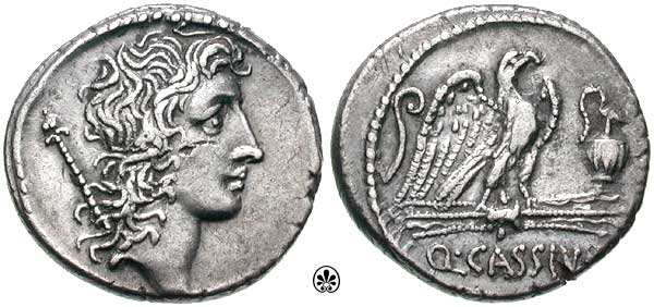 Q Cassius AR Denarius. Head of Bonus Eventus, sceptre behind / eagle on thunderbolt right between lituus & jug, Q CASSIVS below. Syd 916, Cr428/3.