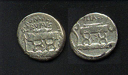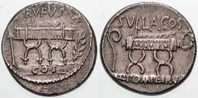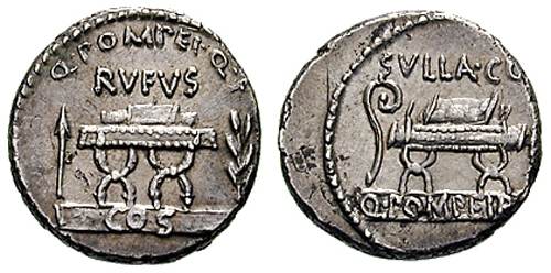 Q Pompeius Rufus AR Denarius. 54 BC. Rome mint. Q POMPEI Q F RVFVS above, curule chair flanked by arrow & laurel-branch; COS on raised tablet below / SVLLA COS above, curule chair flanked by lituus & a wreath; Q POMPEI RVF on raised tablet below. Cr434/2, Syd 909.