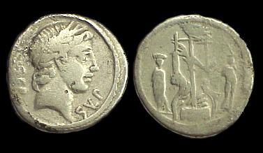 Servius Sulpicius Denarius. 51 BC. SER SULP, laureate head of Apollo right / Naval trophy (aplustre, anchor & mast), clothed figure left, Macedonian captive right. Syd 931, Cr438/1.