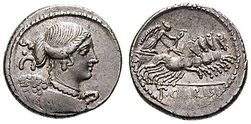 T Carisius Denarius. 46 BC. Bust of Victory right, SC behind / Victory in quadriga right, T CARISI in ex. Syd 985, Cr464/5.