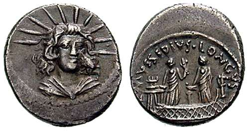 L Mussidius Longus. 42 BC. AR Denarius. Facing bust of Sol, radiate and draped / L MVSSIDIVS LONGVS, Platform inscribed CLOACIN on which are 2 statues of Venus Cloacina. Cr494/43a, Syd 1094.