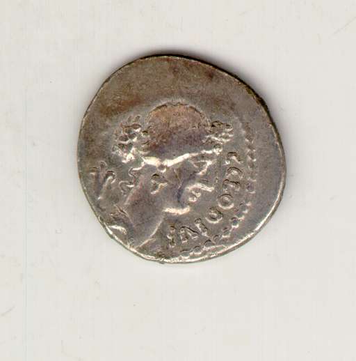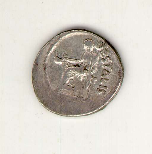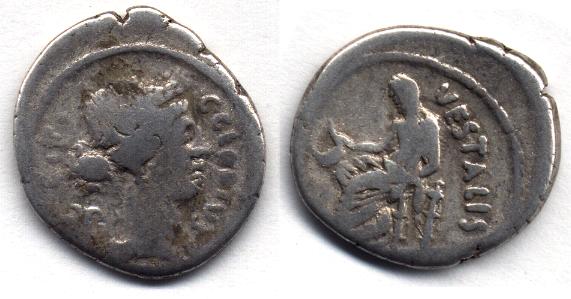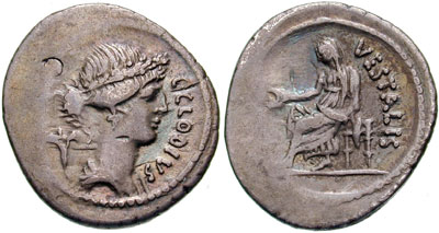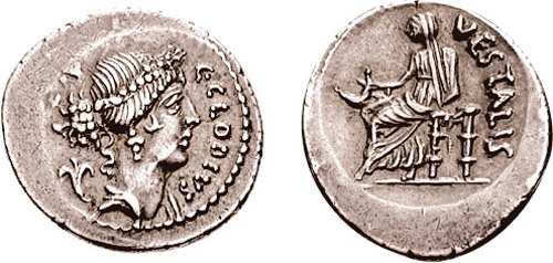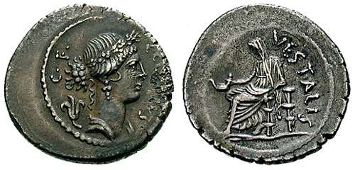 C. Clodius Vestalis. 41 BC. AR Denarius. Laureate draped bust of Flora right; lily at shoulder / Veiled Vestal virgin seated left, holding a two-handled bowl. Cr512/2, Syd 1135.