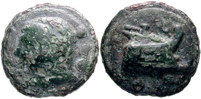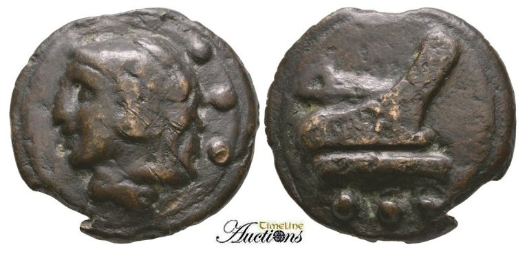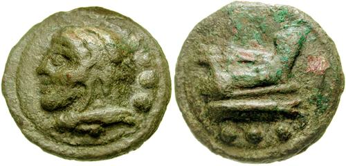 Circa 225-217 BC. AE Aes Grave Quadrans. Head of Hercules left in lionskin, three dots behind; all on raised disk / Prow of galley right, three dots below; all on raised disk. Vecchi 80; HN Italy 340; Crawford 35/4; Sear 582.