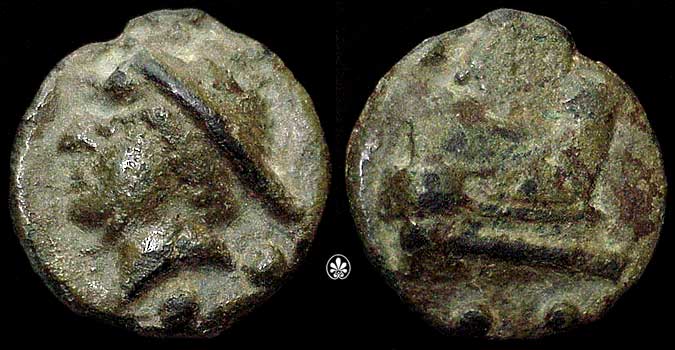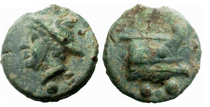 Anonymous. 225-217 BC. AE Aes Grave Sextans. Head of Mercury left, in petasos; oo at lower right / Prow of galley right; oo below. Crawford 35/5; Sydenham Aes Grave 6.