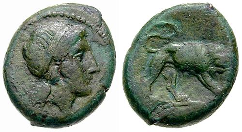 Anonymous. Circa 275-270 BC. Æ Double litra. Female head right / Lion right. Cr 16/1a.