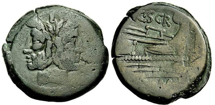 C. Scribonius AE as, 23.41 g. c. 154 BC. Laureate head of Janus; above, mark of value I above / C·SCR above prow right, mark of value I to right. ROMA below. Scribonia 2; Syd. 381; Crawford 201/2; Sear 718.