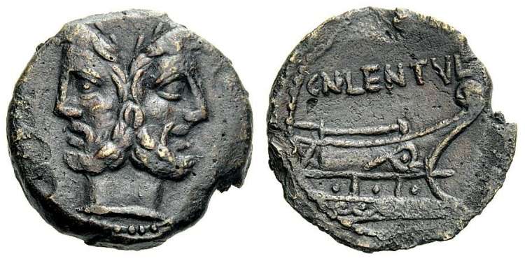 Cn Lentulus Clodianus AE as. 88 BC, Laureate head of Janus. I above / Prow right, CN LENTV above. Crawford 345/3.