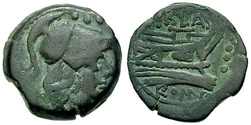 Æ Triens. 169-158 BC. Helmeted head of Minerva right / Prow right; (P)•BLAS above. Cr189/4; Syd 370b.