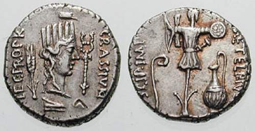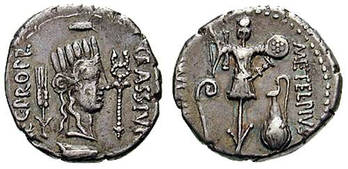 Q Caecilius Metellus Pius Scipio, Imperator, AR Denarius. Struck in Utica, 47-46 BC. CRASS IVN LEG PRO PR, turreted head of Utica right, caduceus before, prow below, grain ear behind / METEL PIVS SCIP.IMP, trophy between lituus & jug. Cr460/3, Syd 1049.