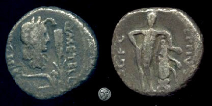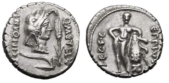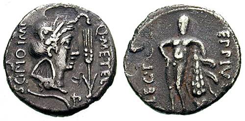 Q Caecilius Metellus Pius Scipio. 47-46 BC. AR Denarius. Q•METELL SCIPIO•IMP, head of Africa right wearing elephant's skin; grain ear before, plow below / EPPIVS LEG•F•C, Hercules standing facing. Cr461/1; Syd 1051.