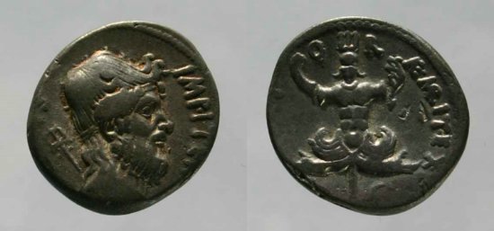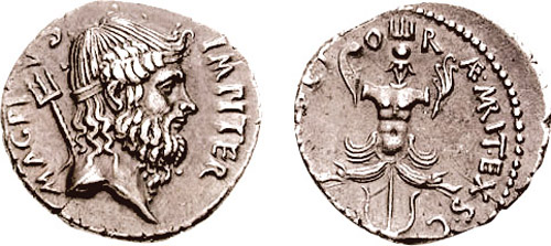 Sextus Pompey Denarius. 42 BC. MAG PIVS IMP ITER, diademed head of Neptune right, trident behind / PRAE F CLAS ET ORAE MAR IT EX SC, naval trophy set on an anchor, heads of the sea monsters Scylla and Charybdis below.