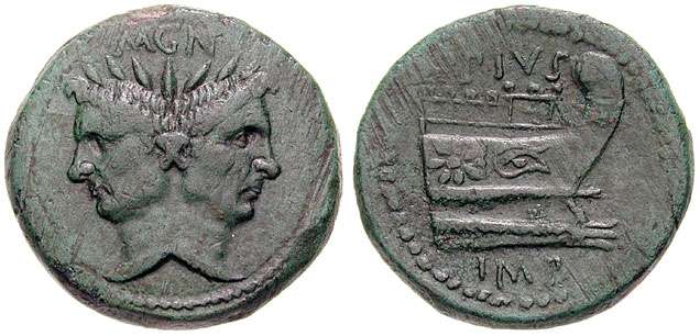 Sextus Pompey Æ As. Sicilian Mint, 43-36 BC. MAGN above laureate janiform head with features of Pompey the Great / PIVS above, IMP below, prow of galley right. RPC 671, Pompeia 20, Cr479/1, Syd 1044a.