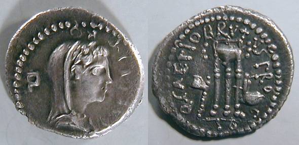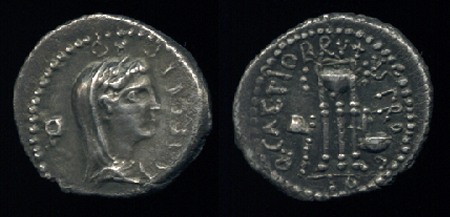 Brutus Denarius. L SESTI PRO Q, veiled, draped bust of Libertas right / Q CAEPIO BRVTVS PRO COS, tripod between sacrificial ax and simpulum, all within beaded border. Junia 37, Syd 1290, Cr502/2.