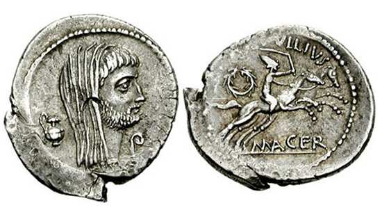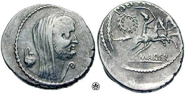 Marc Antony denarius. Veiled head of Antony right / SEPVLLIVS MACER, horseman galloping right. Syd 1077.