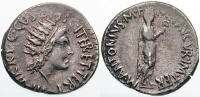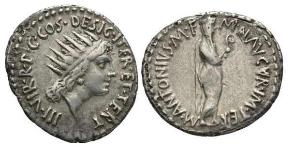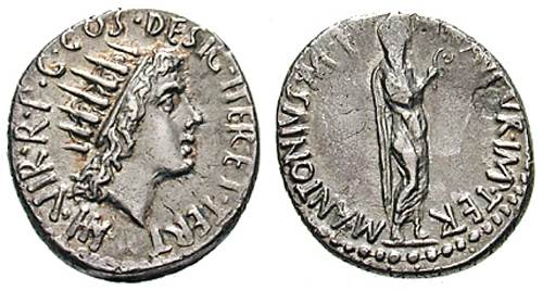 Mark Antony Denarius. Athens mint, 38-37 BC. M ANTONIVS M F M N AVGVR IM TER, Antony standing right, dressed as priest, veiled, wearing toga & holding a lituus / III VIR R P C COS DESIG ITER ET TERT, radiate head of Sol right. Cr533/2; Syd 1199.