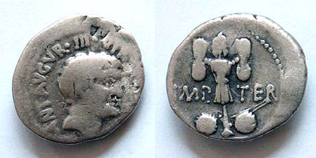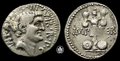 Mark Antony. 37 BC. AR Denarius. Bare head of Antony right / Trophy holding sword and shield, two oblong shields at the base. Crawford 536/4; Sydenham 1202.