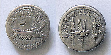 Marc Antony 32-31 B.C. AR Denarius. AR Legionary Denarius. Legion XVII Classicae. 3.376 grams. Praetorian ship r., with sceptre tied with fillet on prow; above, ANT AVG; below, III. VIR. R.P.C. / Aquila (eagle) between two standards; around, LEG XVII CLASSICAE.