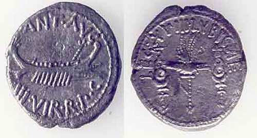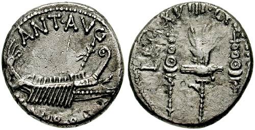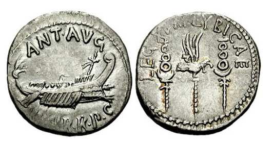 Mark Antony AR Legionary Denarius. Patrae (?) mint, struck Autumn 32 BC-Spring 31 BC. Praetorian galley right / LEG XVIII LYBICAE, legionary eagle between two standards. Cr544/11, Syd 1240.