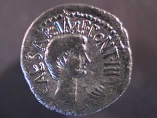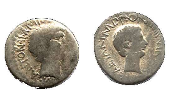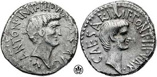 Mark Antony & Octavian Denarius. M ANTON IMP III VIR R P C AVG, bare head of Antony right / CAESAR IMP PONT III VIR R P C, bare head of Octavian right.