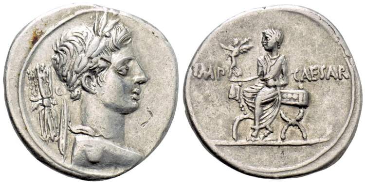 Octavian Denarius. Uncertain Italian mint, 29-27 BC. Laureate terminal bust right, thunderbolt behind / IMP-CAESAR, Octavian seated togate left on curile chair, holding Victory. RSC 116.