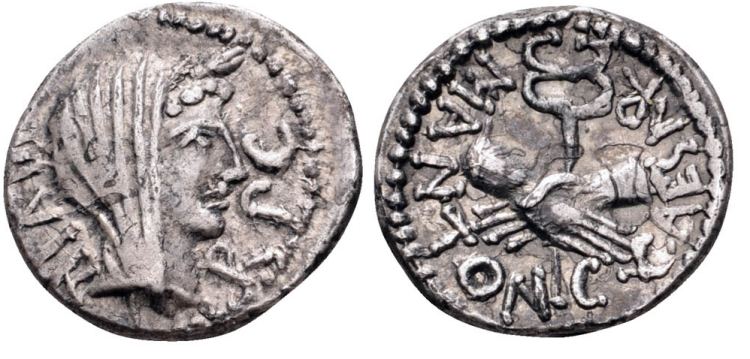 Mark Antony AR Quinarius. 40-39 BC. IIIVIR R P C, diademed and veiled head of Concordia right / M ANTON C CAESAR, clasped hands holding caduceus. Crawford 529/4b, Syd 1195.