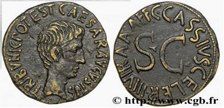 Augustus Æ Dupondius. Struck 16 BC, C Cassius Celer, moneyer. CAESAR AVGVSTVS TRINVNIC POTEST, three lines in wreath / C CASSIVS CELER IIIVIR AAAFF around large S C. Cohen 409.