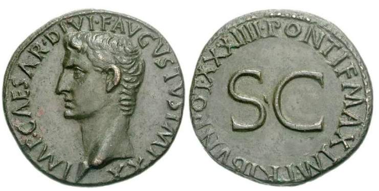 Augustus AE As. Rome mint, 4 BC. IMP•CAESAR•DIVI•F•AVGVSTVS•IMP•XX, bare head left / •PONTIF•MAXIM•TRIBVN•POT•XXXIIII around large SC. Cohen 226.
