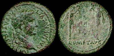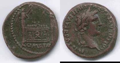 Augustus AE Semis. 9-14 AD. CAESAR AVGVSTVS DIVI F PATER PATRIAE, laureate head right / ROM ET AVG beneath the Altar of Lugdunum. Cohen 568.