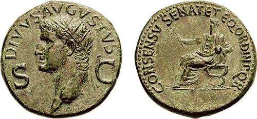 Caligula & Divus Augustus Æ Dupondius. 37-41 AD. CONSENSV SENAT ET EQ ORDIN P Q R, laureate & togate statue of Gaius Caligula seated left on curule chair, holding branch / DIVVS AVGVSTVS S-C, radiate head of Divus Augustus left. Cohen 87.