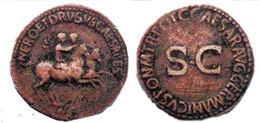 Nero and Drusus Caesars AE Dupondius. NERO ET DRVSVS CAESARES, Nero and Drusus on horseback galloping right / C CAESAR DIVI AVG PRON AVG P M TR P IIII PP around large SC. Cohen 2.
