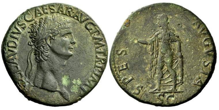 Claudius Æ Sestertius. TI CLAVDIVS CAESAR AVG P M TR P IMP, laureate head right / SPES AVGVSTA, Spes standing left, holding flower and raising hem of skirt, SC in ex. Cohen 85.