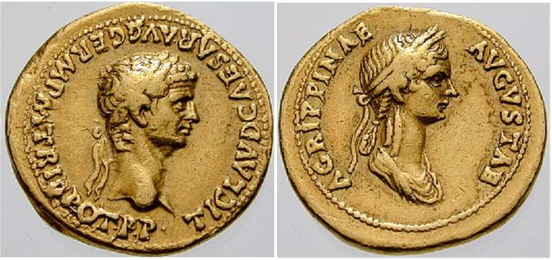 Claudius & Agrippina AV Aureus. TI CLAVD CAESAR AVG GERM P M TRIB POT P P, laureate head right / AGRIPPINAE AVGVSTAE, draped bust of Agrippina right. BMC 72.