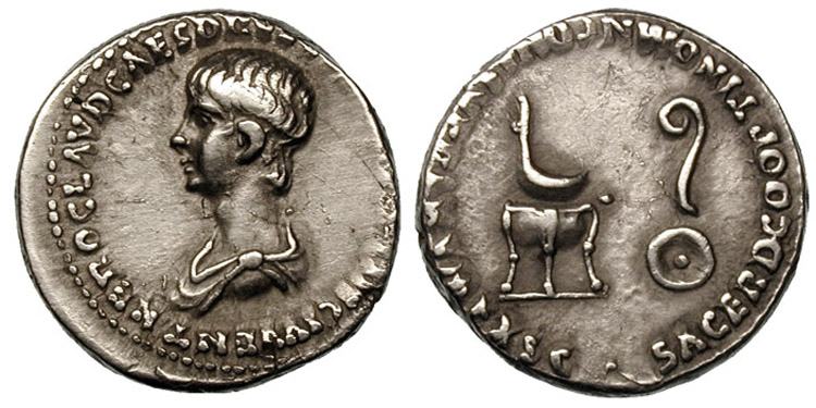 Nero, as Caesar, AR Denarius. 51-54 AD. NERO CLAVD CAES DRVSVS GERM PRINC IIVENT, young draped bust left / SACERD COOPT IN OMN CONL SVPRA NVM EX SC, simpulum on tripod and lituus on patera. RSC 312.