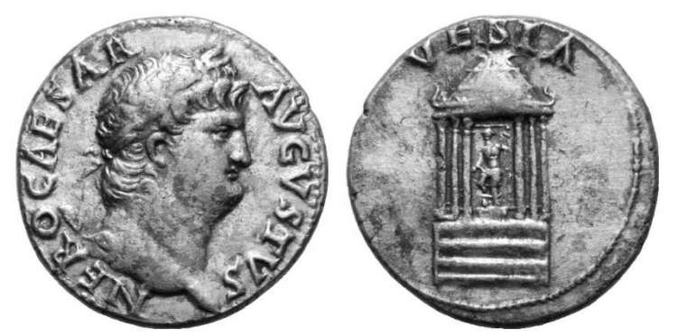 Nero Denarius. NERO CAESAR AVGVSTVS, laureate head right / VESTA, hexastyle temple of Vesta with domed roof & statue of Vesta within. RSC 335.