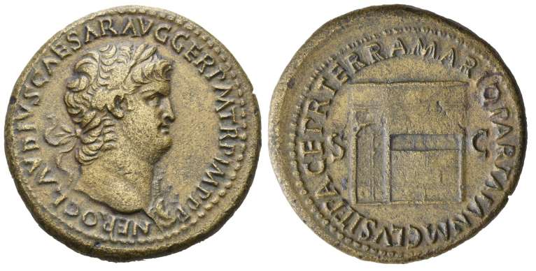Nero, AE sestertius, Rome. AD 54-68. NERO CLAVDIVS CAESAR AVG GER P M TR P IMP P P, laureate head right, with aegis. / PACE P R TERRA MARIQ PARTA IANVM CLVSIT, S-C, temple of Janus with door on the left. RIC 270; Cohen 134; BMC 164; MacDowall 140; Paris 366.