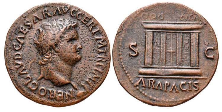 Nero, AE as, Lyons mint. 29 mm, 9.35 g. AD 65. NERO CLAVD CAESAR AVG GER P M TR P IMP P, Bare head right, globe at point of bust. / Large altar with double doors, S-C across fields, ARA PACIS below. RIC 458; BMC 361; Cohen 27.